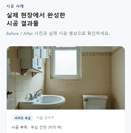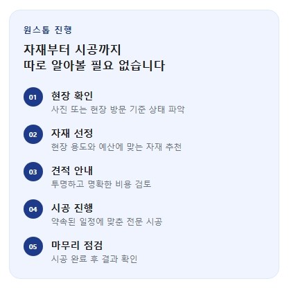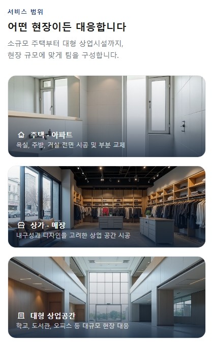 욕실 한 칸, 주방 벽 일부 같은 소규모 공사도 문의해 주시면 검토해드립니다. 현장 사진 기준으로 1차 확인 후 안내해드립니다.