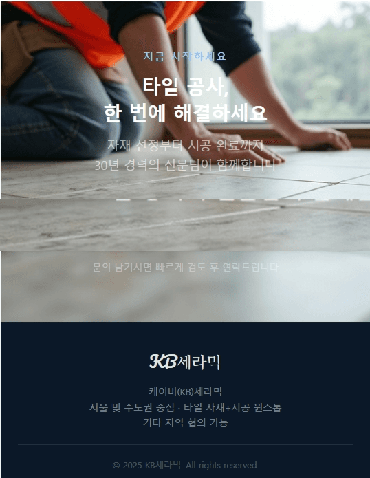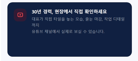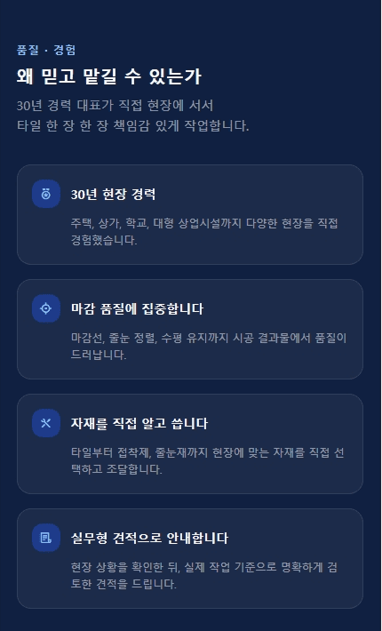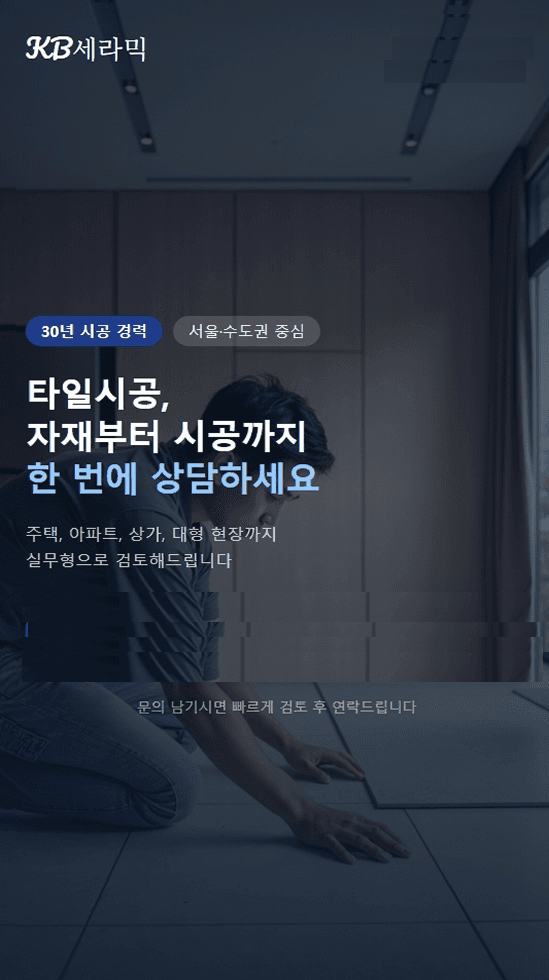 깨진 타일 교체나 줄눈 보수 같은 부분 작업도 문의 주시면 검토해드립니다. 현장 상태를 사진으로 보내주시면 보다 정확하게 판단할 수 있습니다.