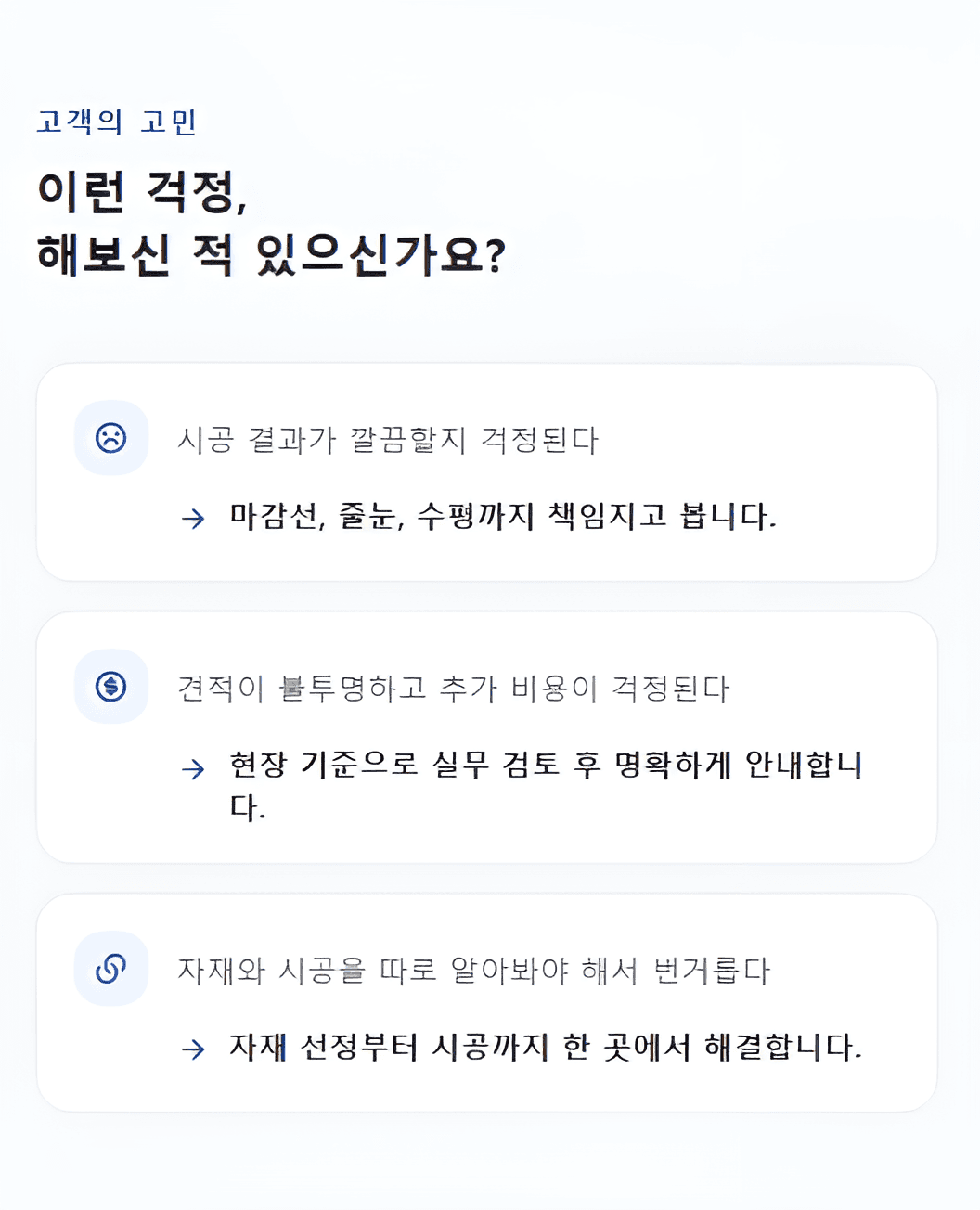 철거 후 재시공까지 한 번에 진행합니다. 철거 현장 상태에 따라 추가 작업이 필요할 수 있으며, 해당 사항도 견적 시 함께 안내해드립니다.