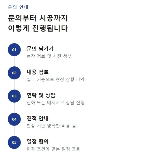 문의 양식을 통해 현장 정보와 사진을 보내주시면, 내용 검토 후 빠르게 연락드립니다. 필요한 경우 현장 방문 일정을 별도로 협의합니다.
